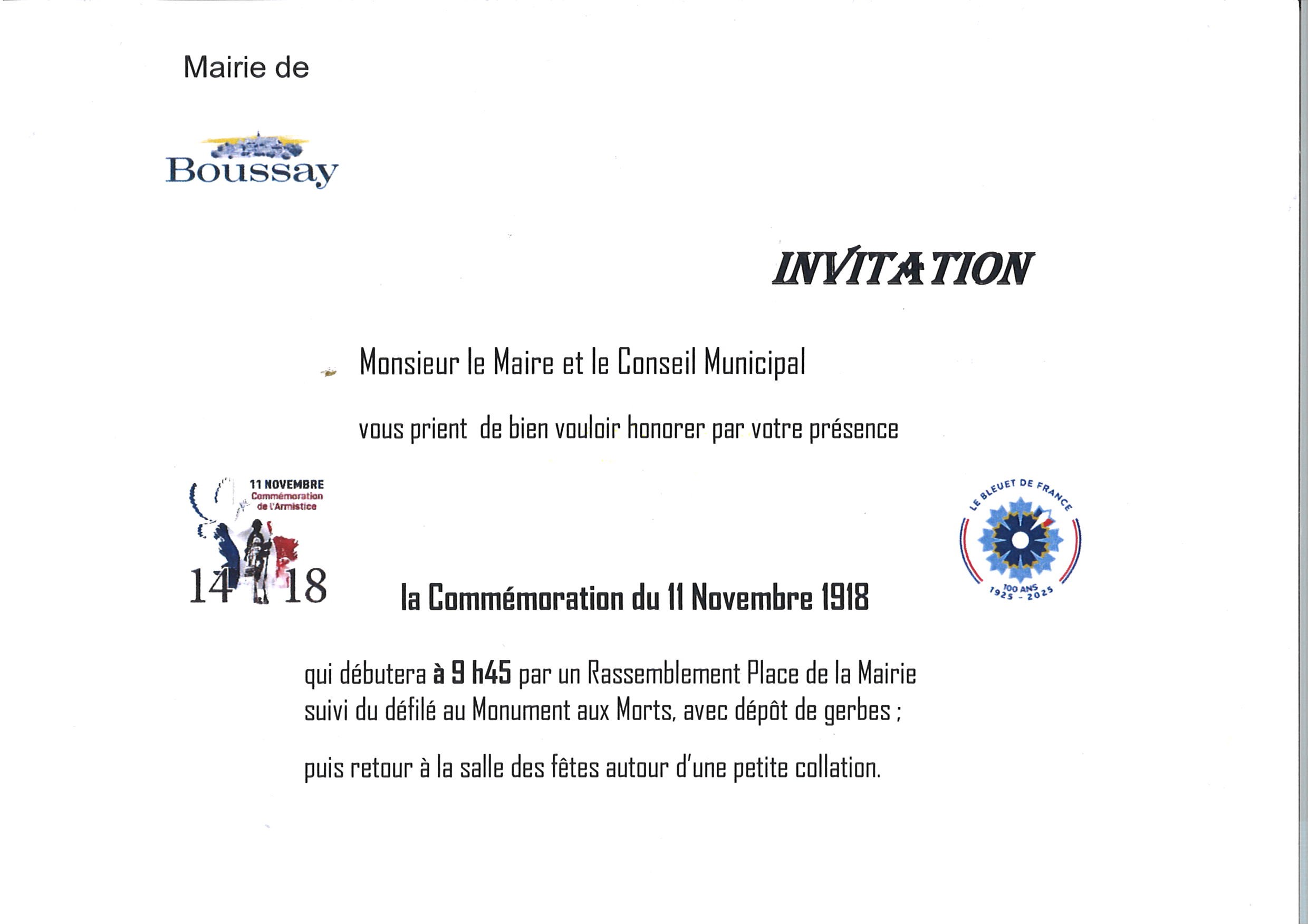 Monsieur Le Maire et le Conseil Municipal vous prient de bien vouloir honorer par votre présence la Commémoration du 11 novembre 1918 qui débutera à 9h45 par un rassemblement place de la mairie suivi du défilé au monuments aux morts, avec dépôt de gerbes puis retour à la salle des fêtes autour d’une petite collation.